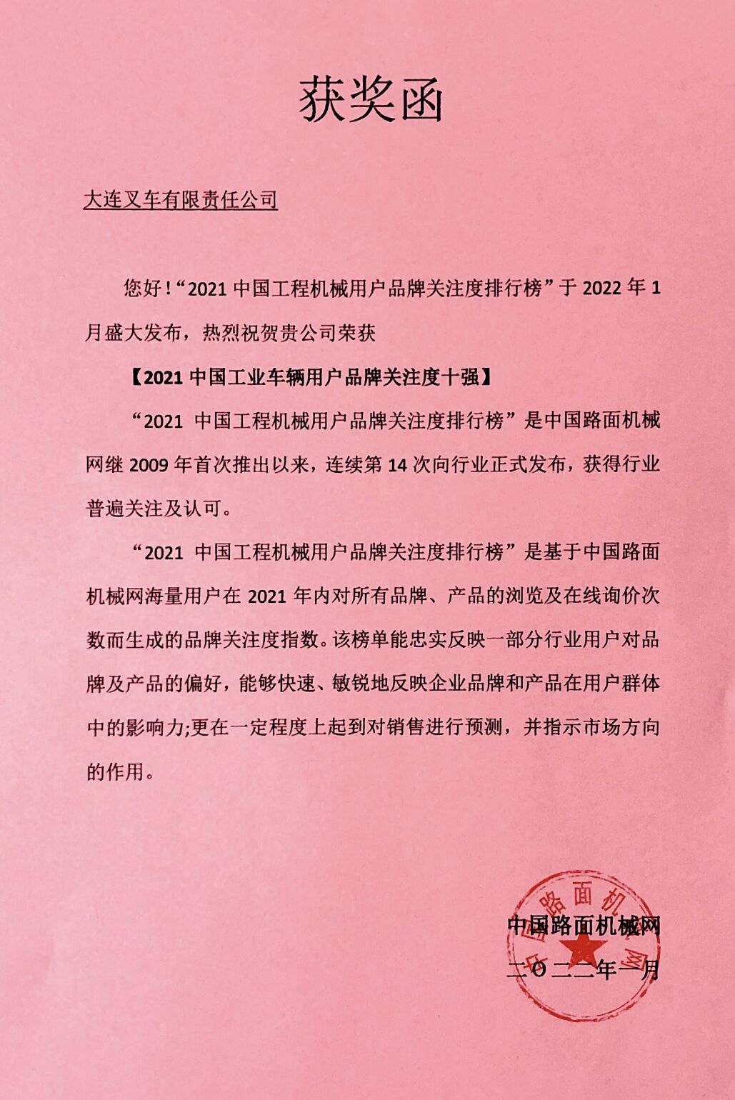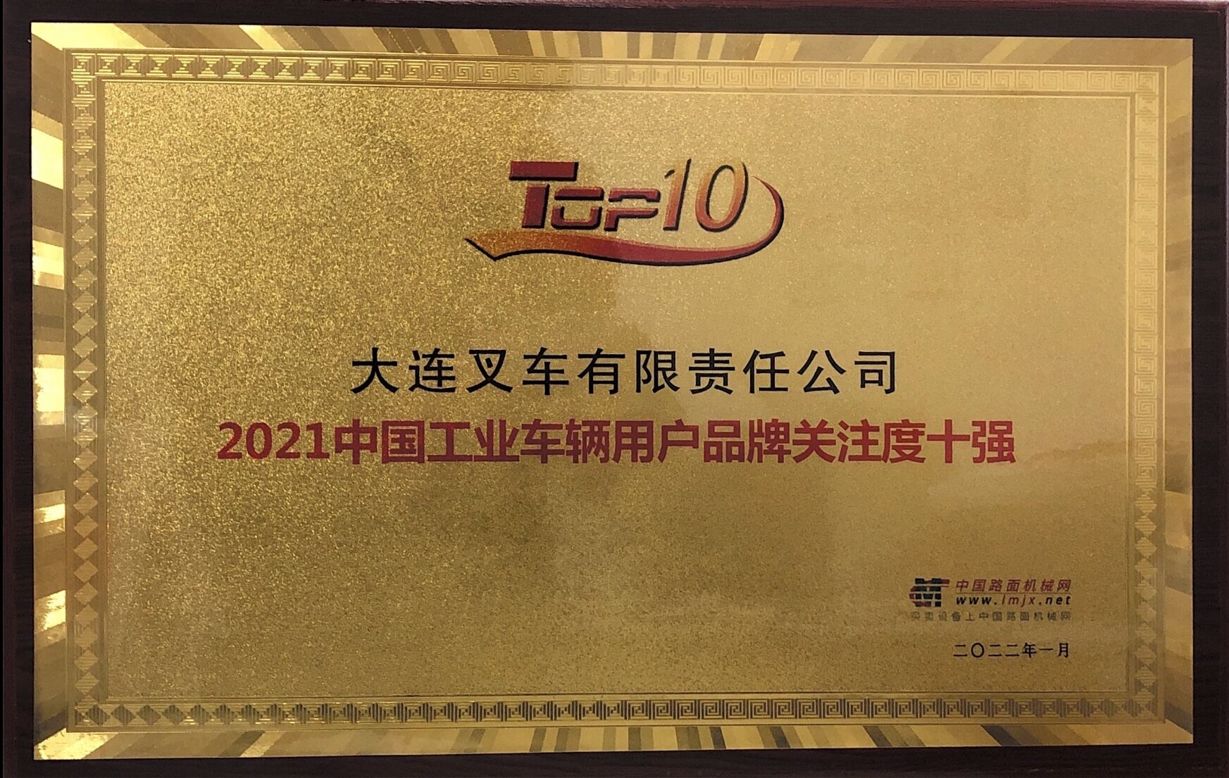大連叉車有限責任公司榮獲“2021 中國工業車輛用戶品牌關注度十強”!